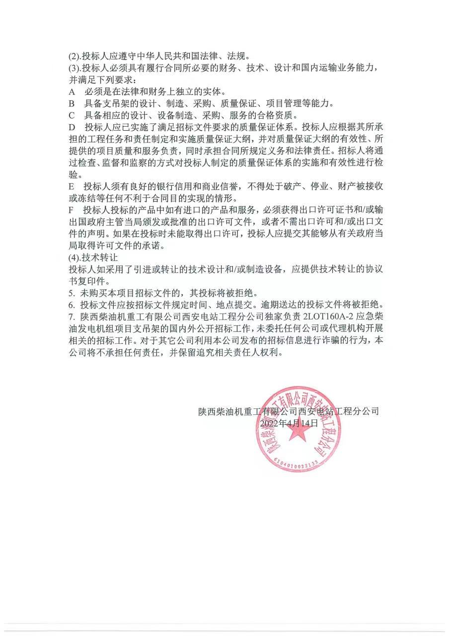 2LOT160A-2應(yīng)急柴油發(fā)電機組項目支吊架招標公告
