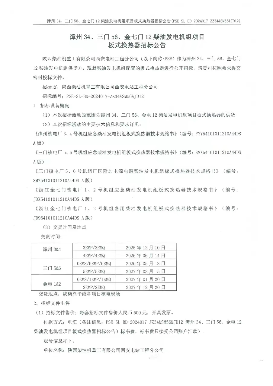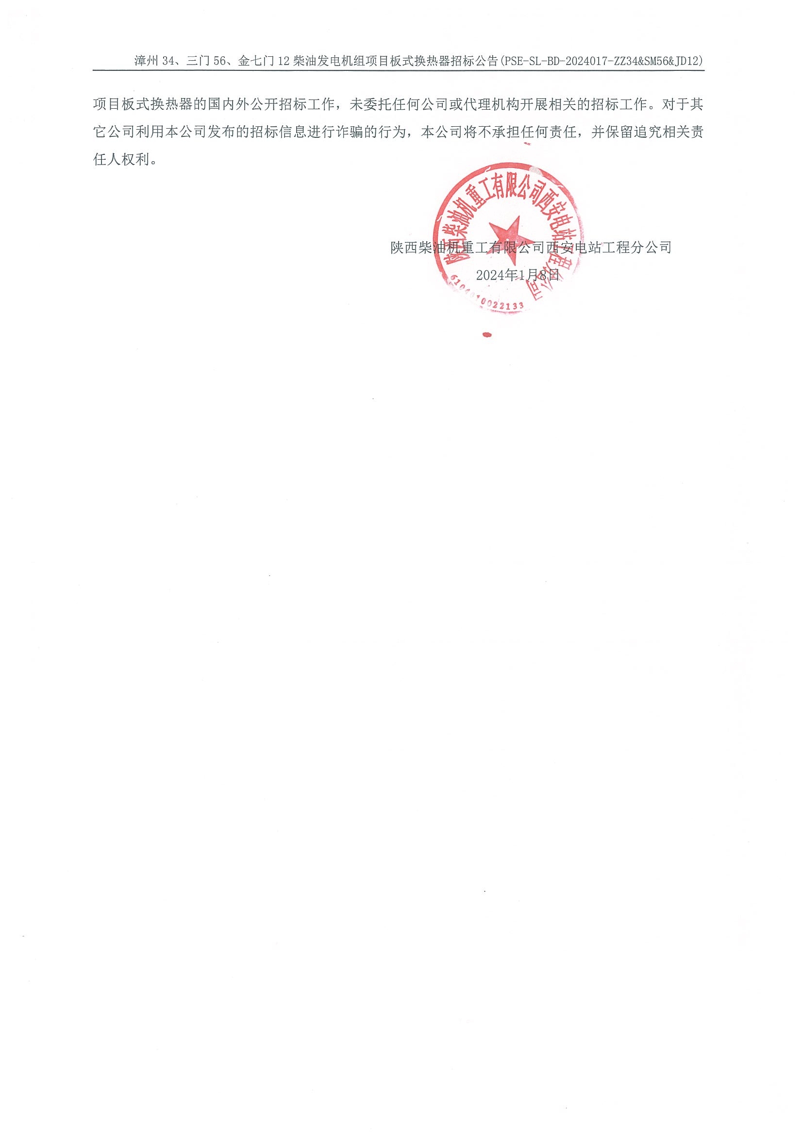 漳州34、三門56、金電12柴油發(fā)電機(jī)組項(xiàng)目板式換熱器招標(biāo)公告
