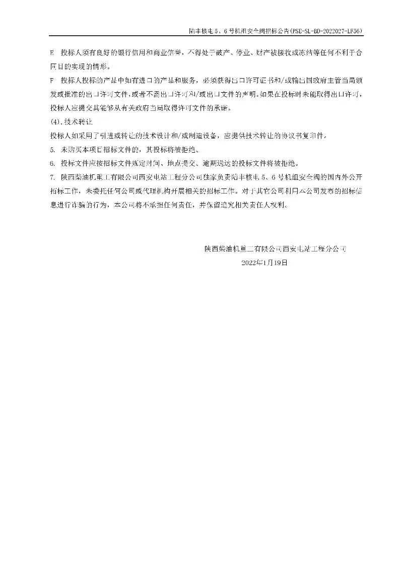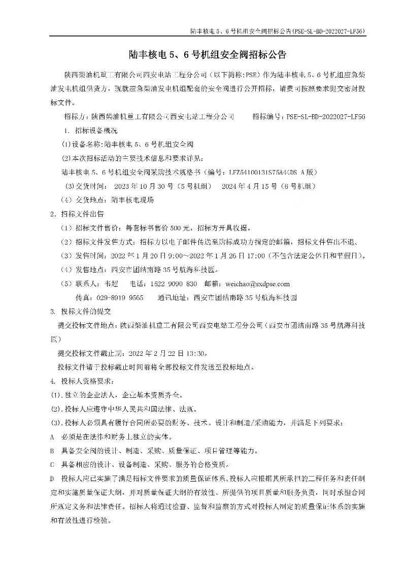 陸豐核電5、6號(hào)機(jī)組安全閥招標(biāo)公告