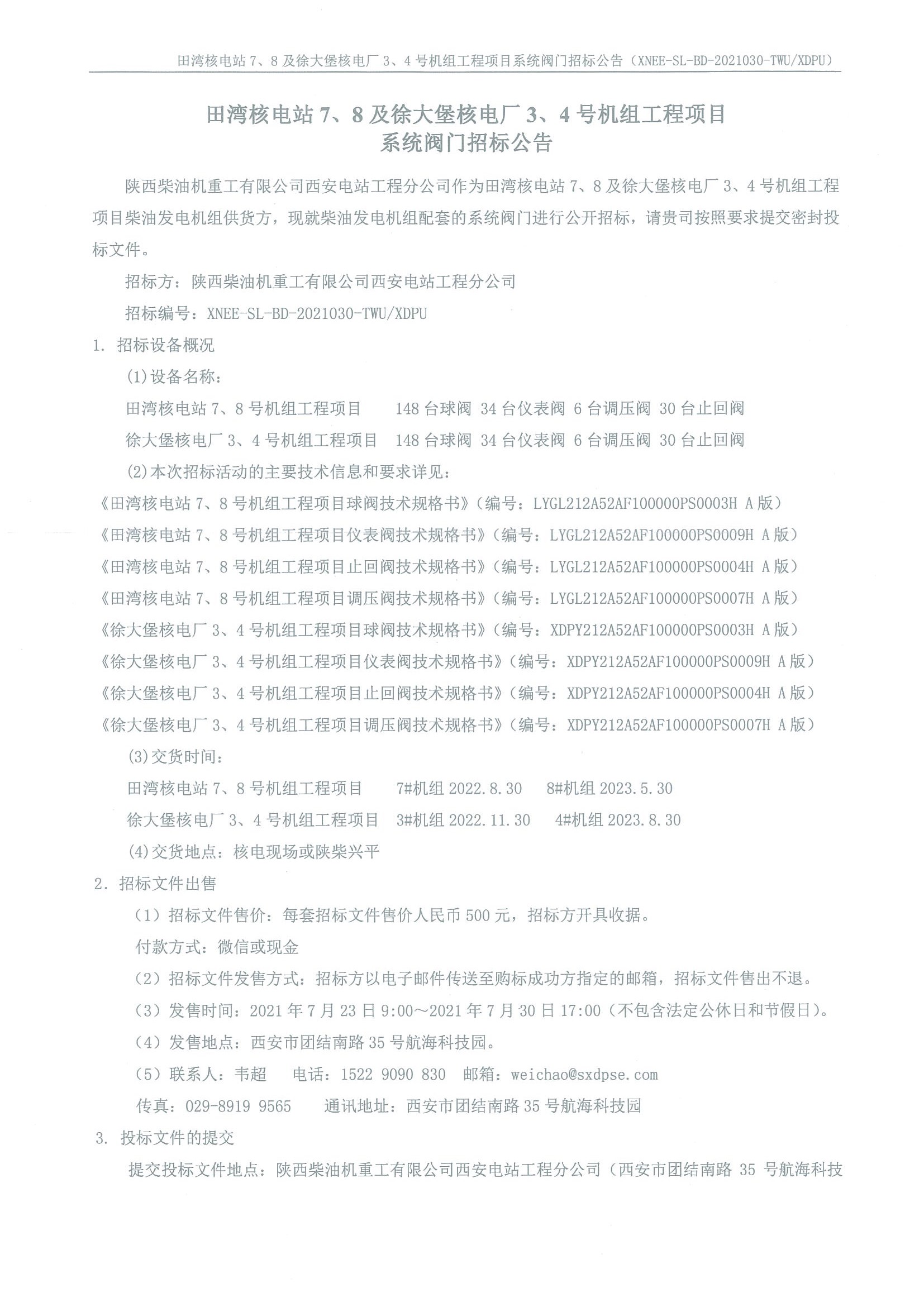 田灣核電站7、8及徐大堡核電廠3、4號機(jī)組工程項目系統(tǒng)閥門招標(biāo)公告