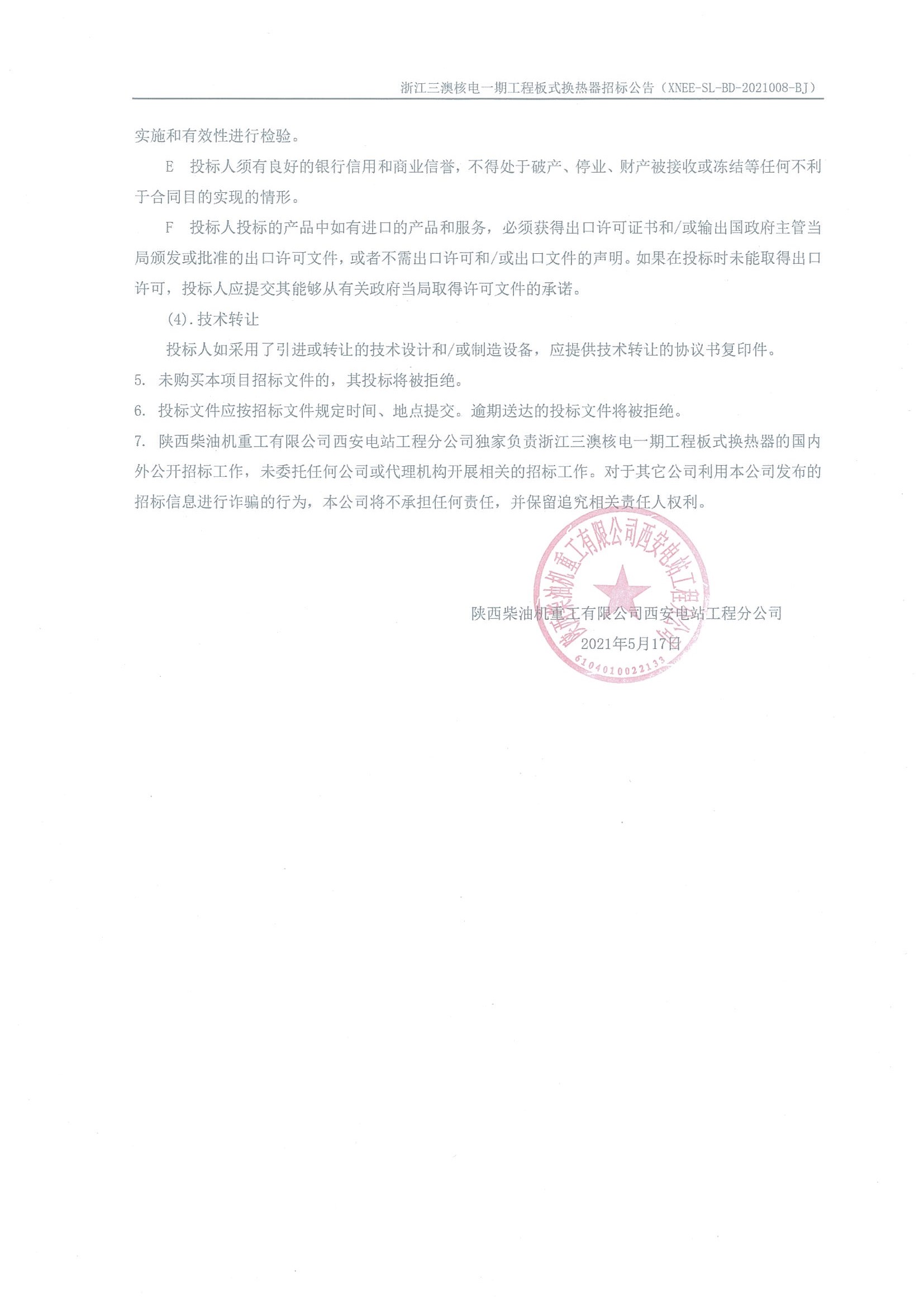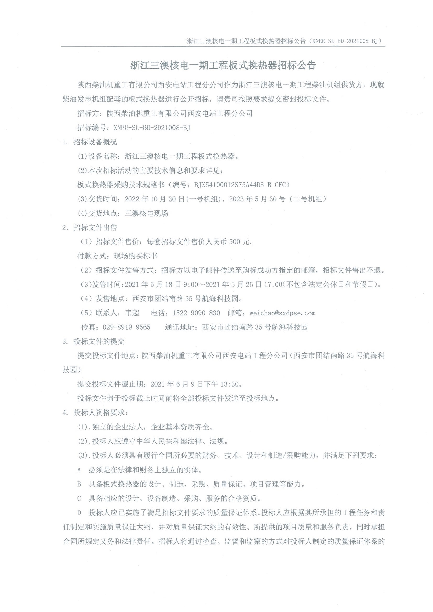 浙江三澳核電一期工程板式換熱器招標(biāo)公告