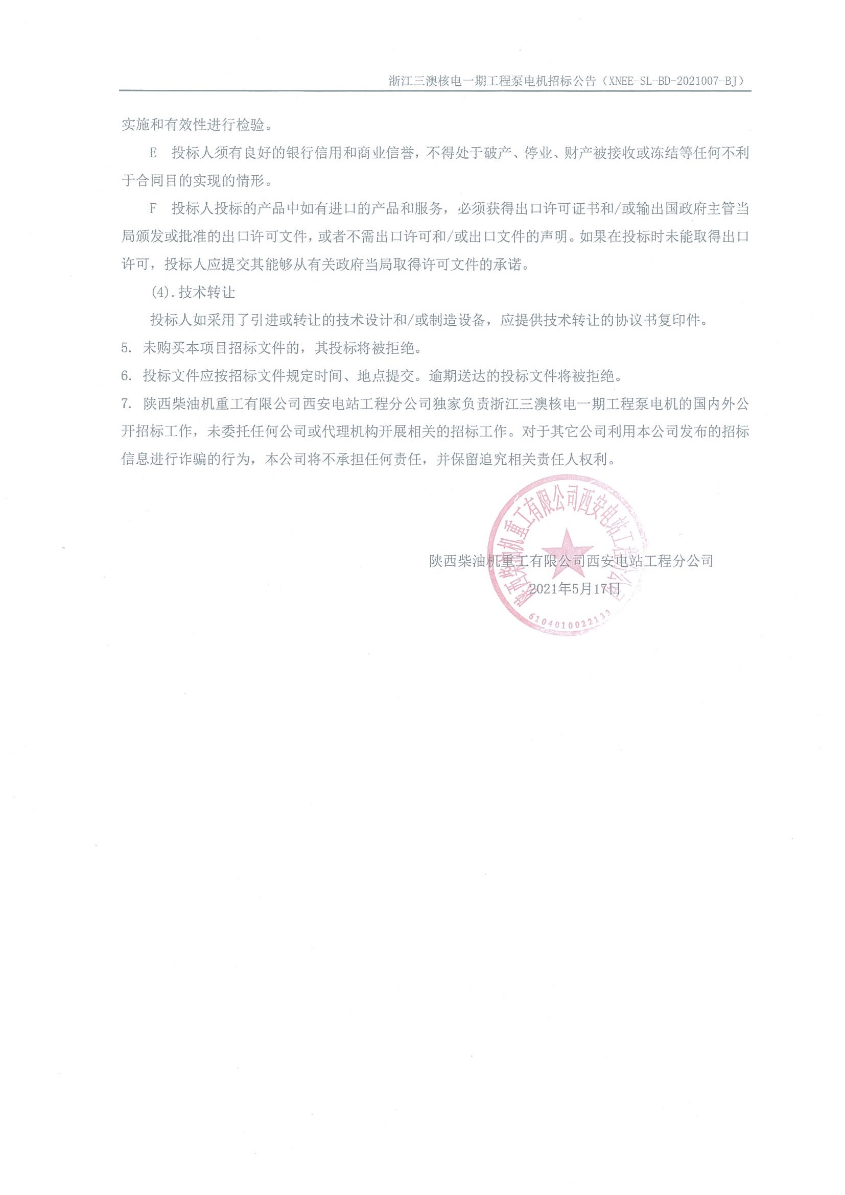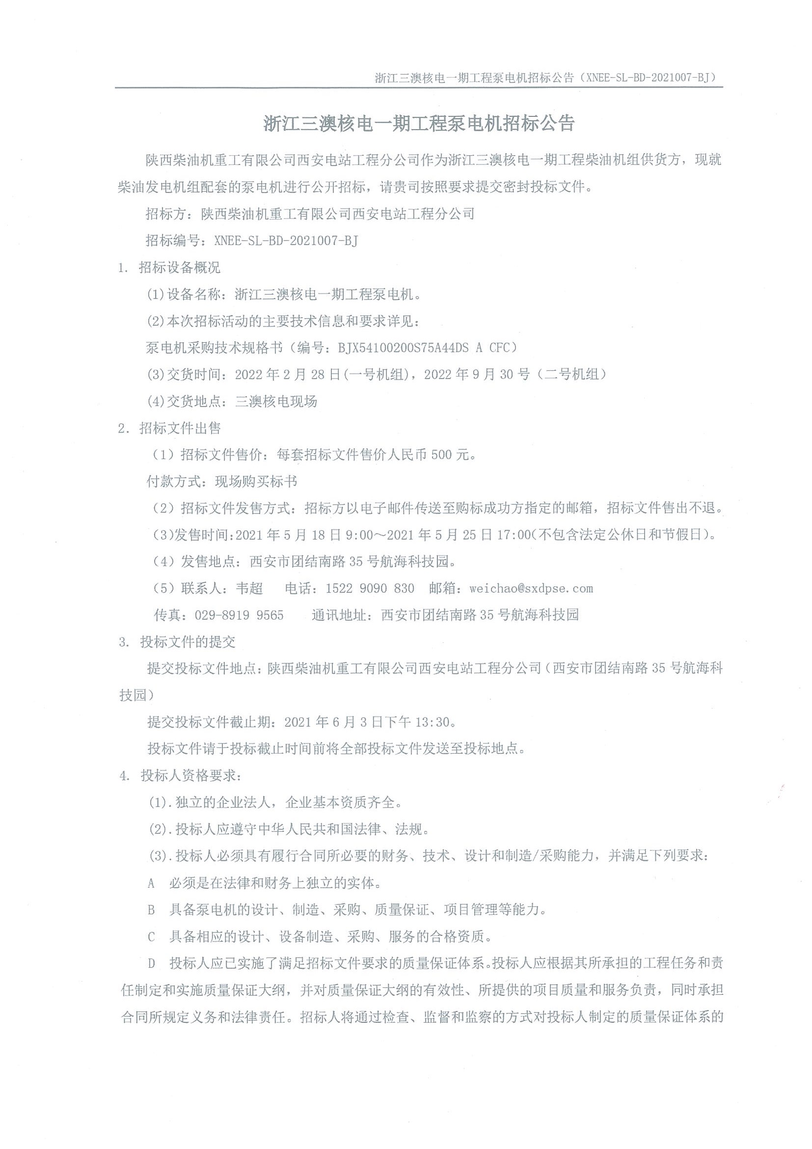 浙江三澳核電一期工程泵電機(jī)招標(biāo)公告