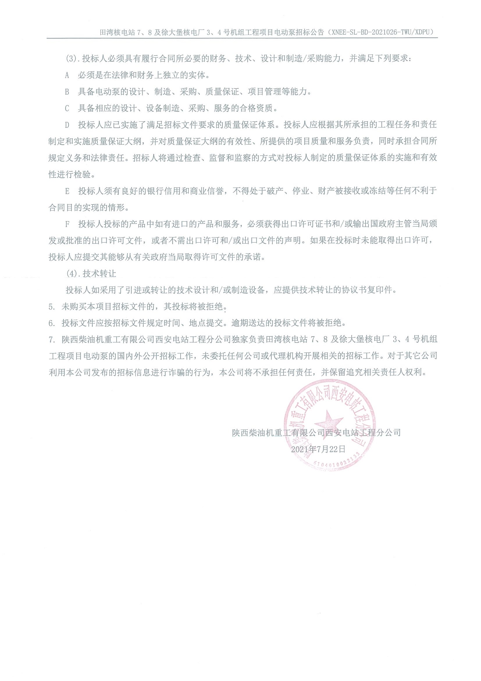 田灣核電站7、8及徐大堡核電廠3、4號(hào)機(jī)組工程項(xiàng)目電動(dòng)泵招標(biāo)公告